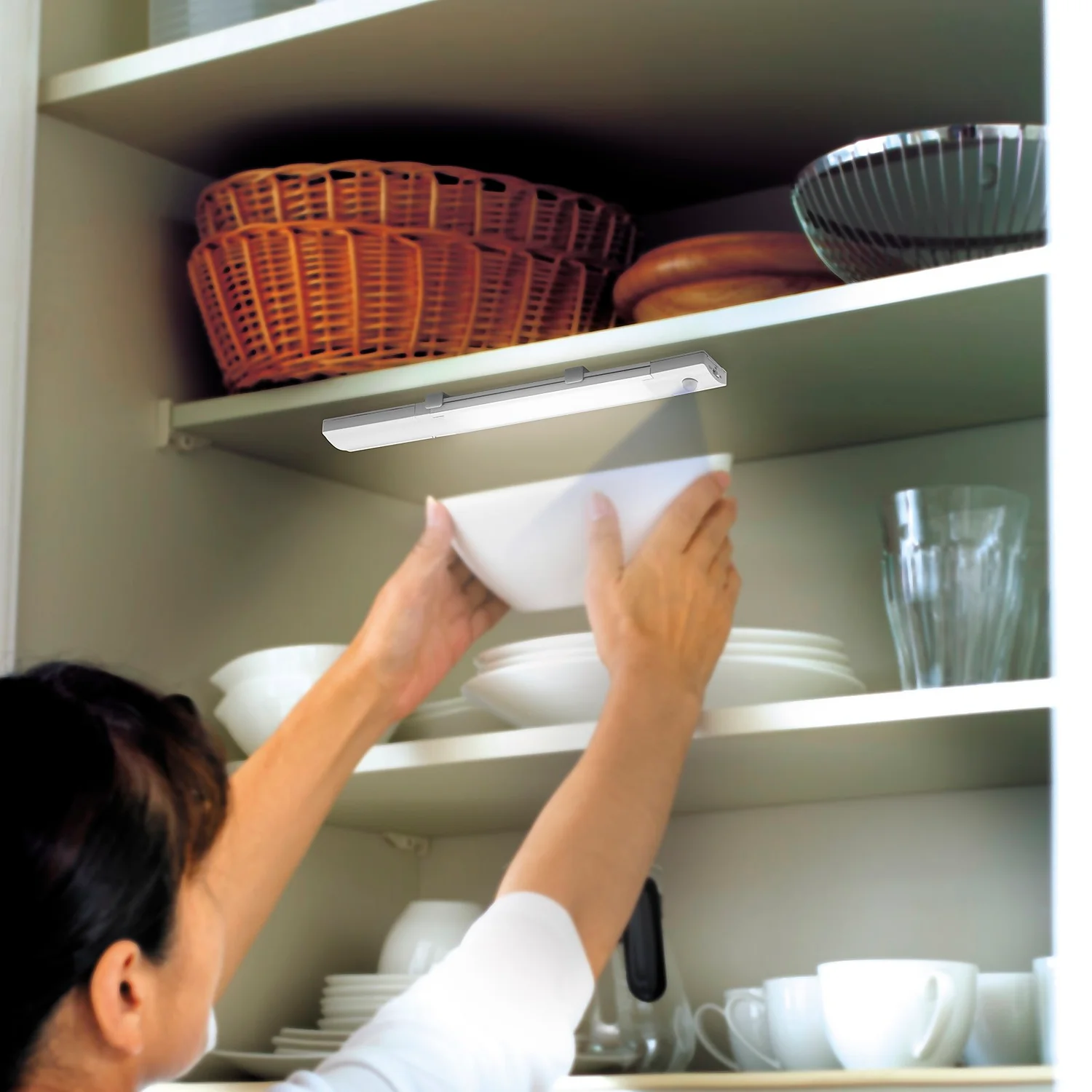 The Arlec Battery Operated LED Under Cabinet Sensor Light works using Passive Infra-Red (PIR) technology, which means it lights up when motion is detected.
