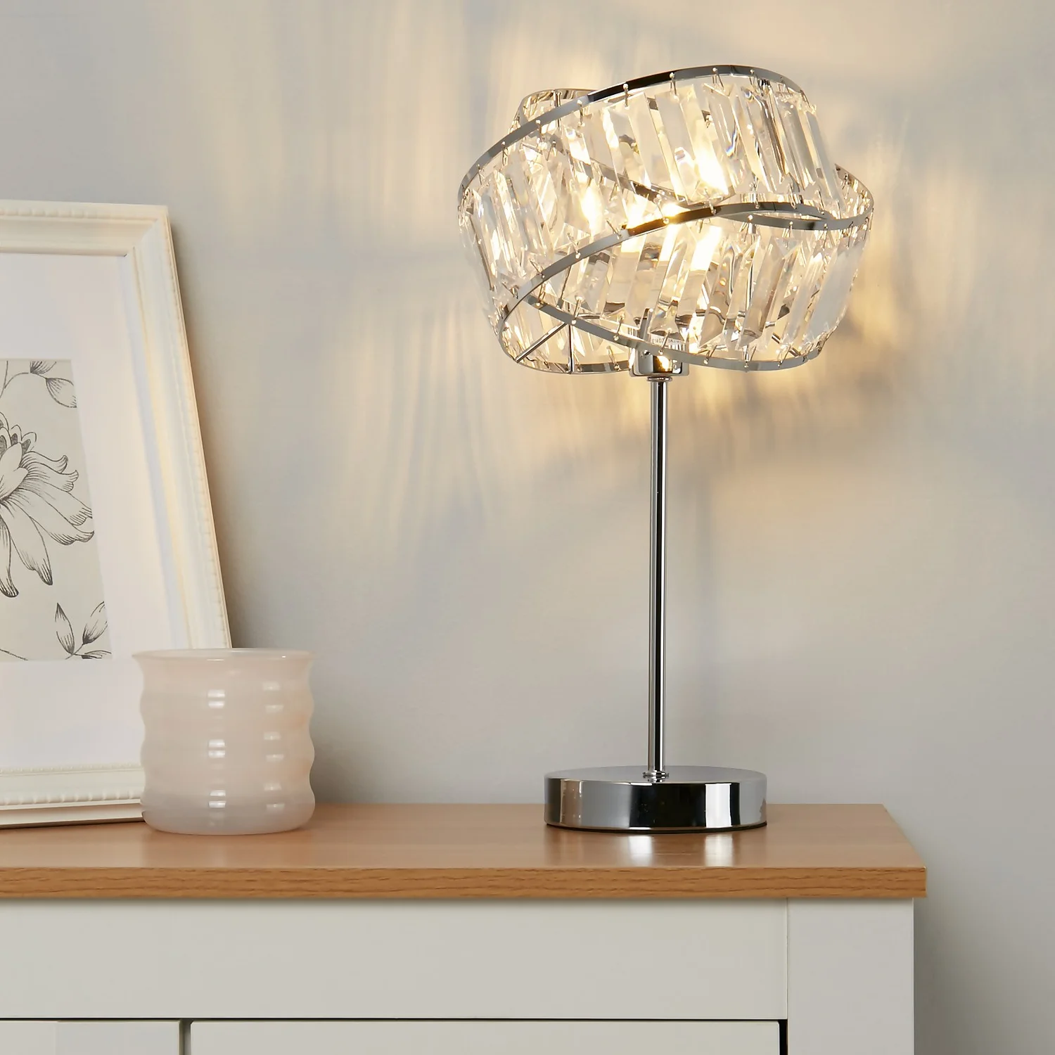 The Dita banded crystal table lamp adds glamour to any home.