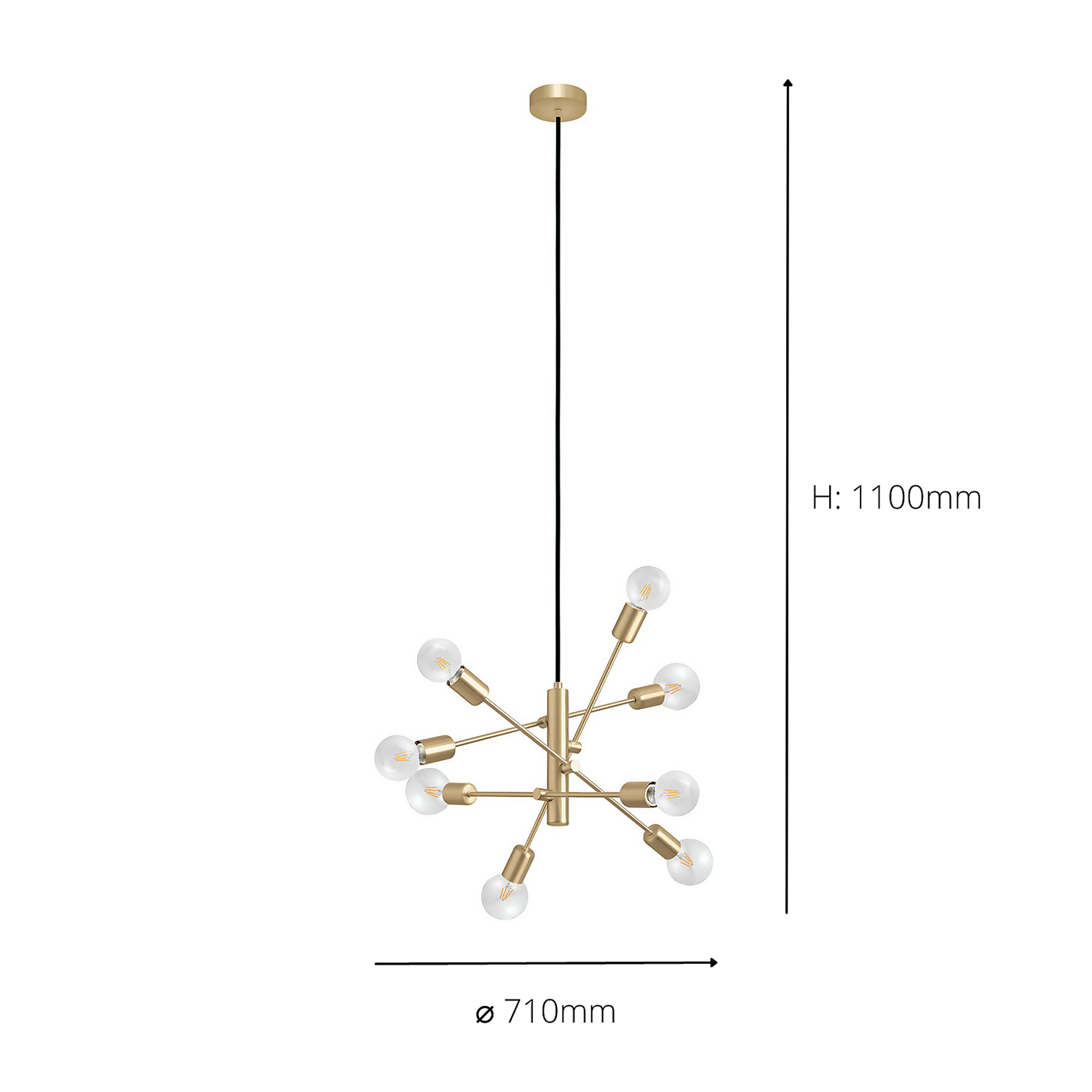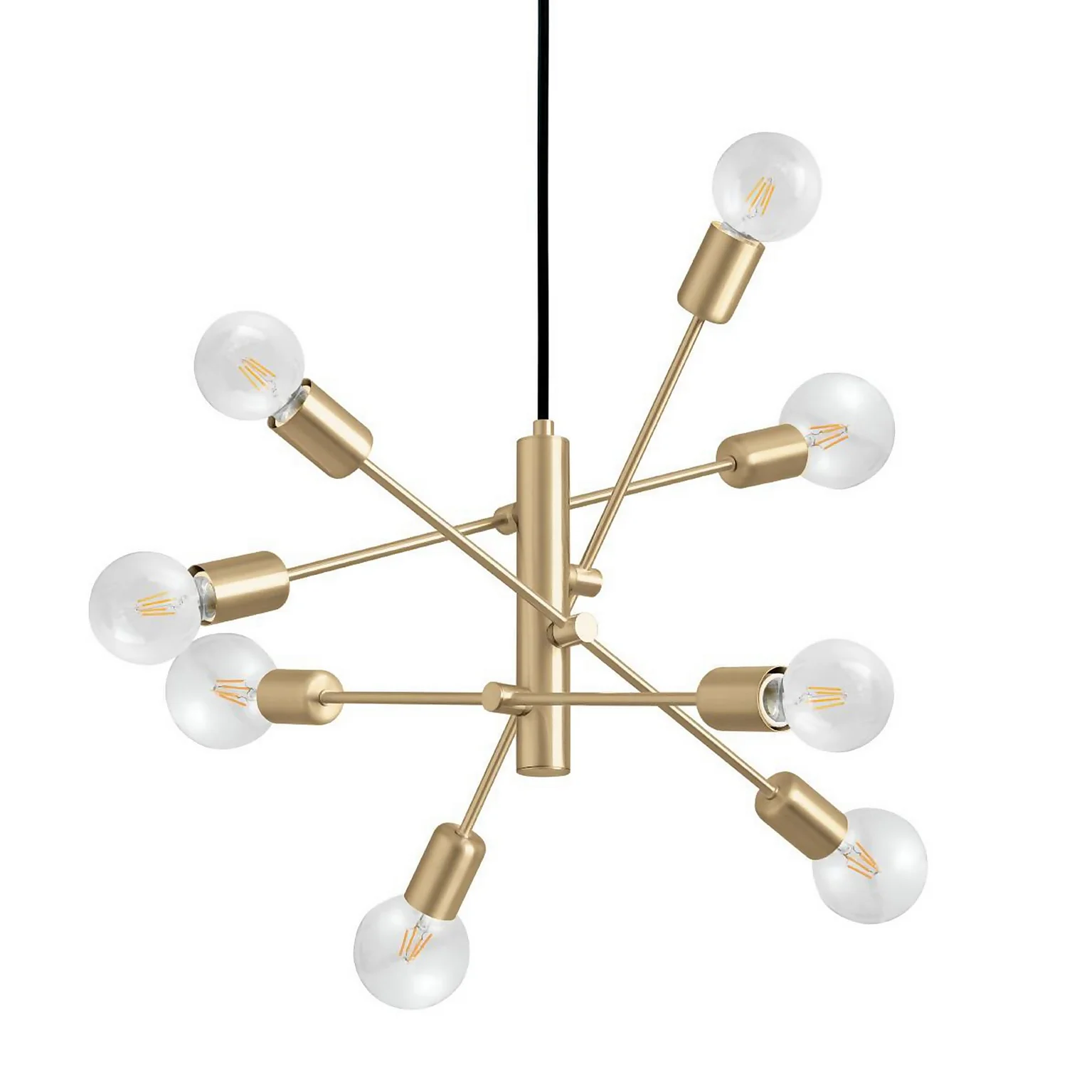 The GRADOLI 1 pendant light features a steel structure with a brushed brass finish. The offset, linear arms are adjustable to create a personalised lighting fixture to complement your style. With a starburst design, eight exposed lightbulb sockets and a black textile cable, this pendant light complements elegant and futuristic interiors. The pendant light blends seamlessly into modern interiors, creating a focal point in any space, whether in the living room or above the dining room table. The product requires 8 x E27 lightbulbs, which are not included.