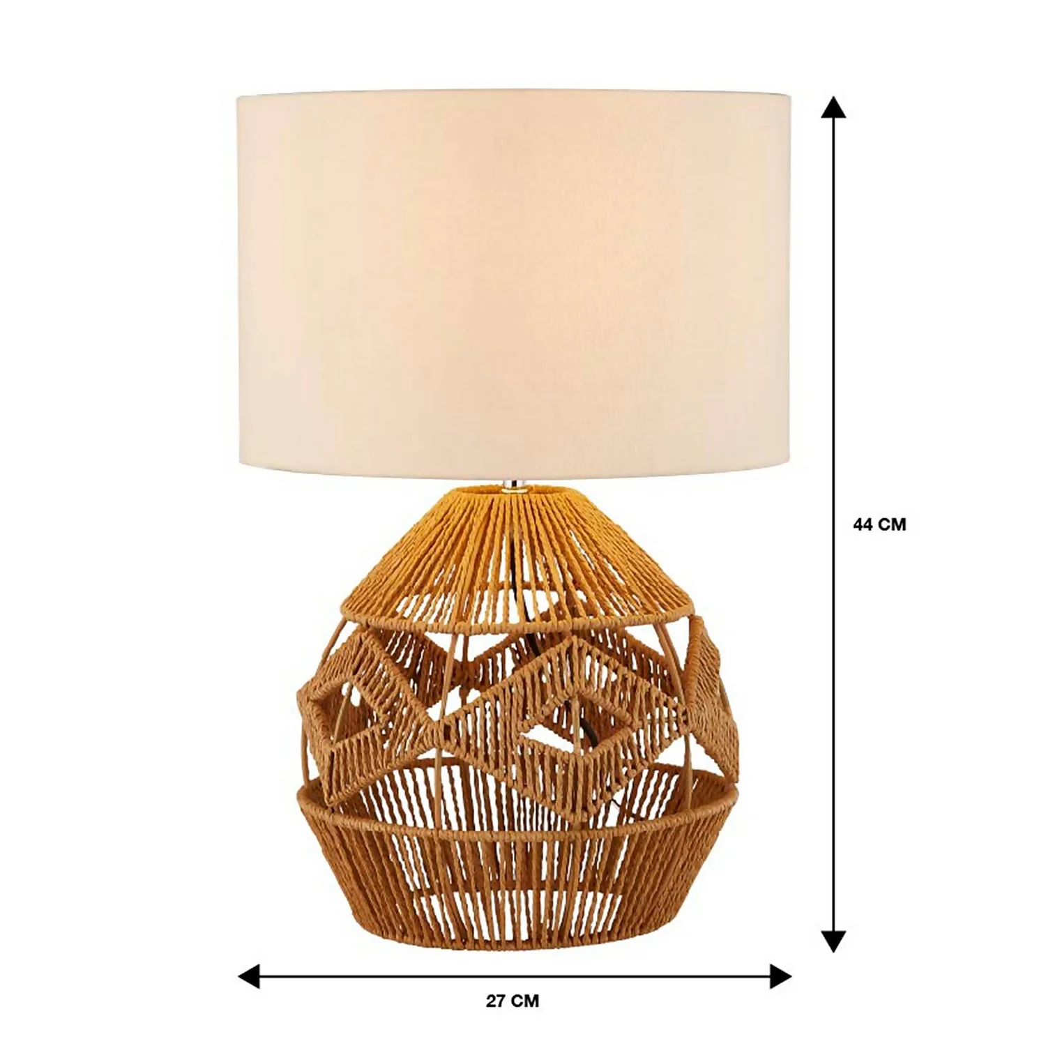 The Kai table lamp is a geometric natural woven rattan base with complementary white shade.