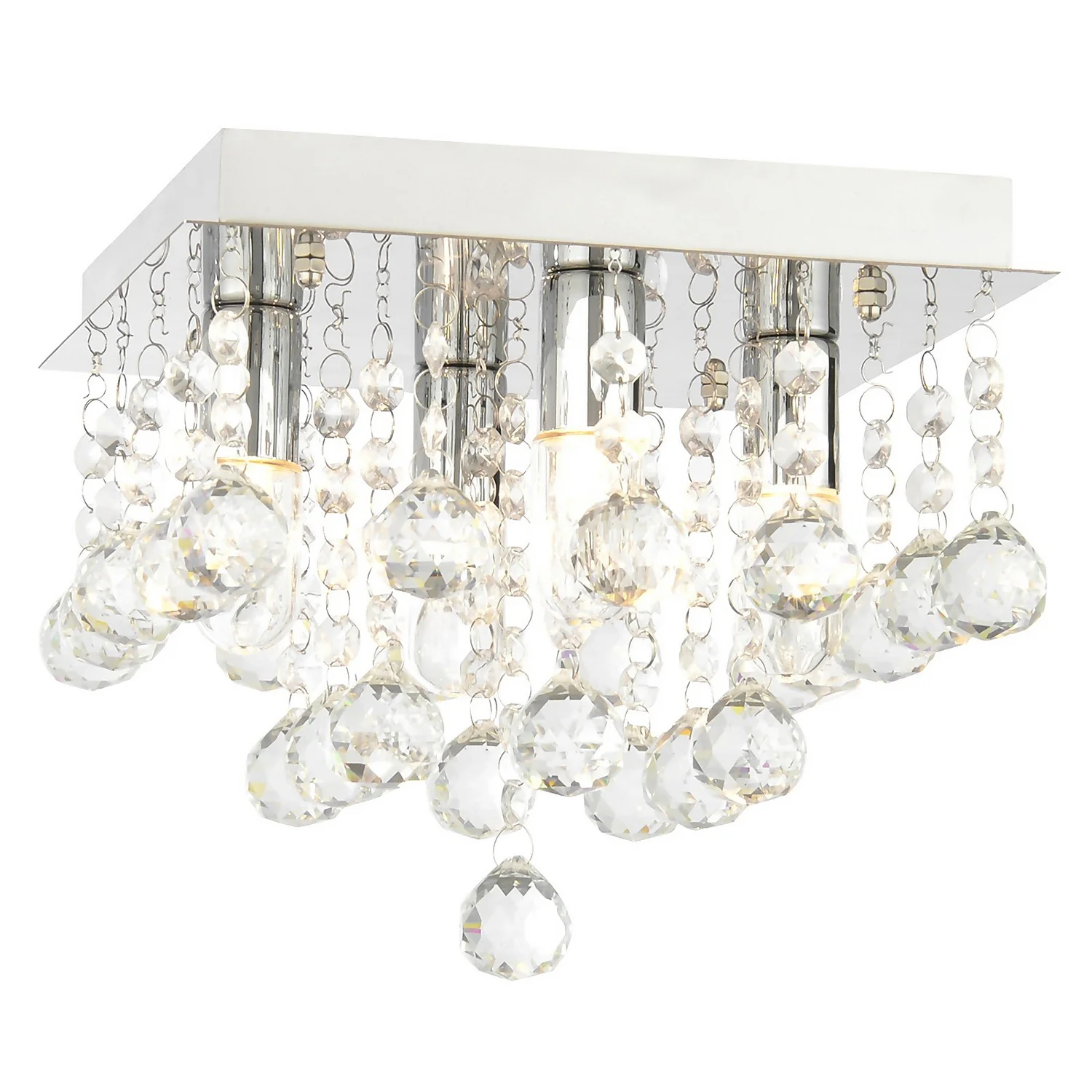 Orlando 23cm Square Flush Ceiling Light Fitting features a square design ceiling plate in a chrome finish with an array of stylish crystal droplets. This captivating light fitting will add a contemporary edge to any bathroom and is IP44 rated.