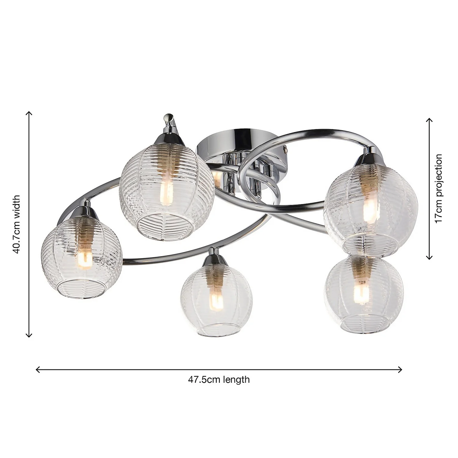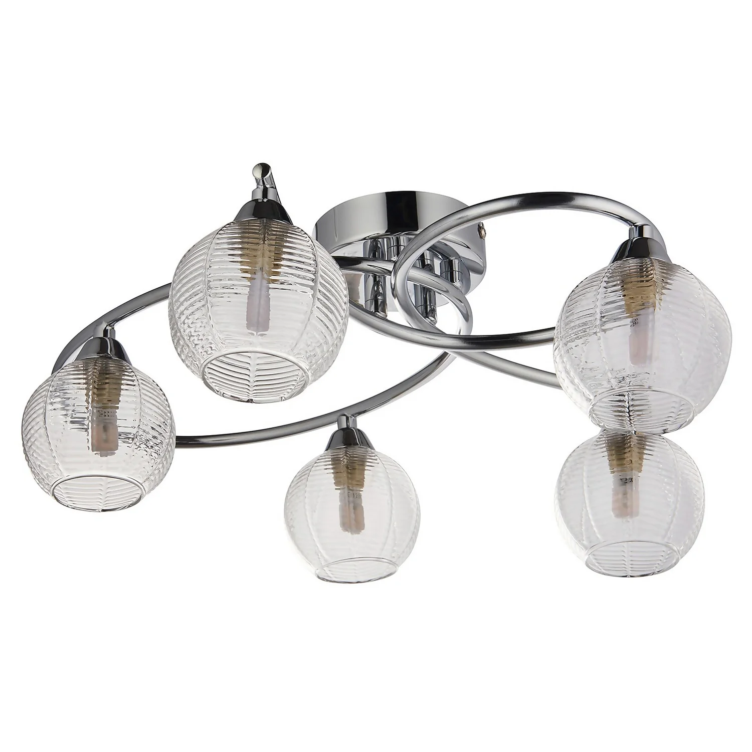 A lovely modern scluptural ceiling light. Chrome plated with complementary clear ribbed glass which creates a beautiful light effect when lit.
