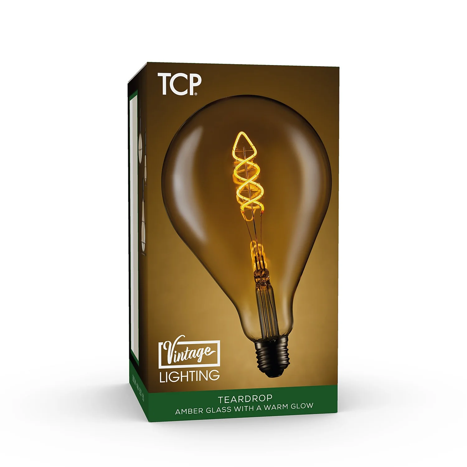 TCP Decorative Soft filament teardrop lightbulb are ideal for pendant lighting and other exposed lighting fittings. With amber glass and a warm glow